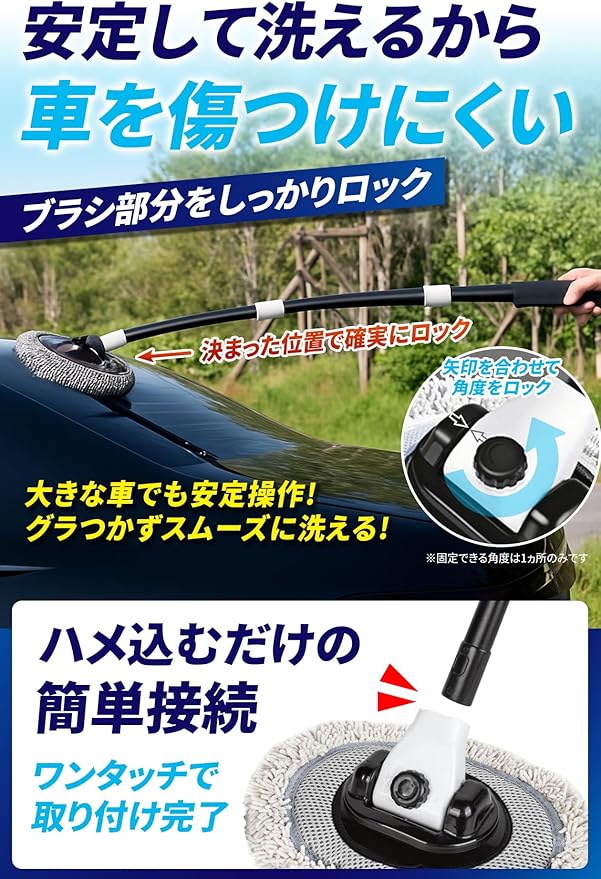 【15度カーブ&90度回転モップヘッドで高所もラクラク】モップヘッドが90度回転し、さらに15度のカーブ設計で車の屋根やフロントガラスなど手の届きにくい部分も簡単に洗車できる洗車モップです。軽量設計のため、女性や高齢者でも負担なくお使いいただけます。家庭の窓や天井掃除にも最適で1本あると幅広く活躍します。