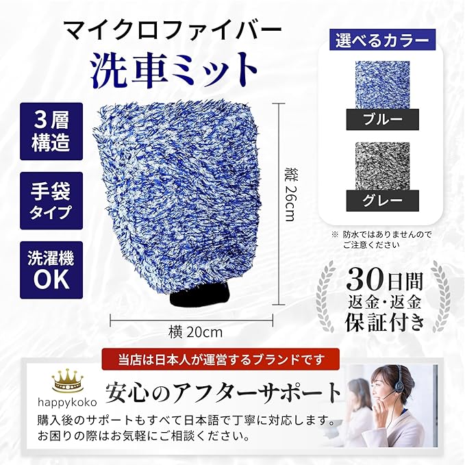 【自動車整備士監修】~監修コメント~「大切な車とあなたの手を守る、安心設計」 マイクロファイバー+スポンジ+ポリエステルの3層構造で、車の塗装を傷つける心配なし。手首部分の柔らかい素材が手を優しく保護し、怪我のリスクを軽減します。