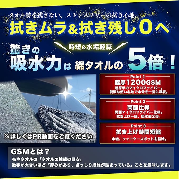 ✅【1200GSM 両面厚手仕様】 超極細マイクロファイバーを贅沢に使用した両面厚手クロス。 ボディの塗装面に優しくフィットし、傷をつけず糸くずも残さない安心設計です。 しなやかな手触りで扱いやすく、繰り返し洗ってもゴワつきにくい耐久性。 高い吸水力と快適な使い心地を兼ね備えた、長く使える洗車タオルです。