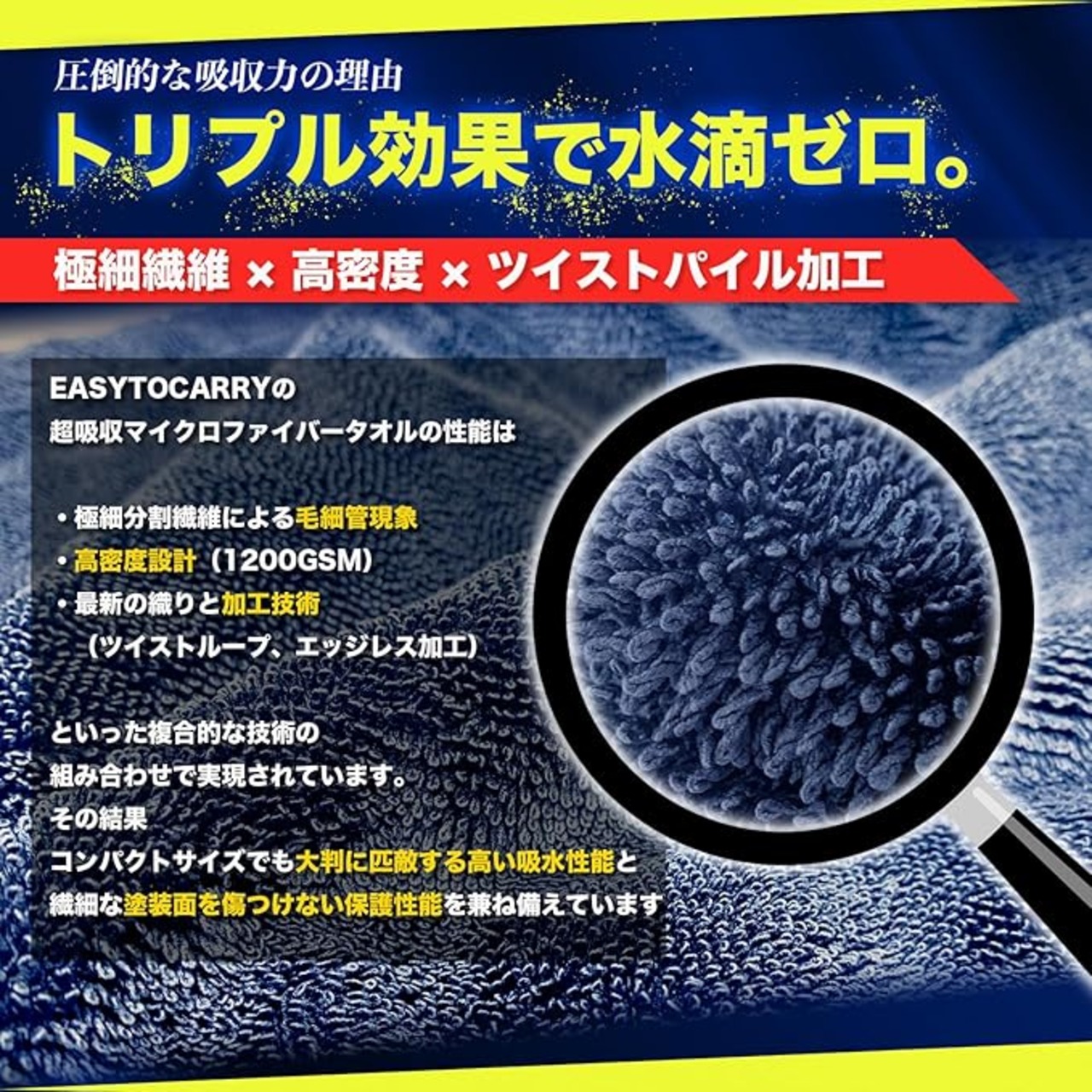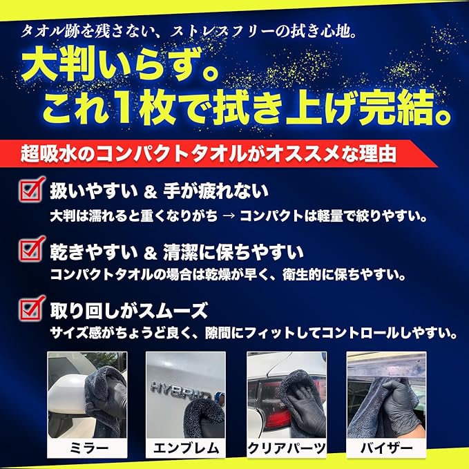 ✅【超吸水の秘密】 超吸収マイクロファイバータオルは、極細分割繊維による毛細管現象、高密度設計(GSM調整)、さらに最新の織り・加工技術(ツイストループ・エッジレス加工)といった複合的な技術によって生み出されています。 これらの相乗効果により、コンパクトサイズでありながら大判に匹敵するほどの高い吸水性能を実現。さらに、繊細な塗装面を傷つけない安心の使い心地を兼ね備えています。