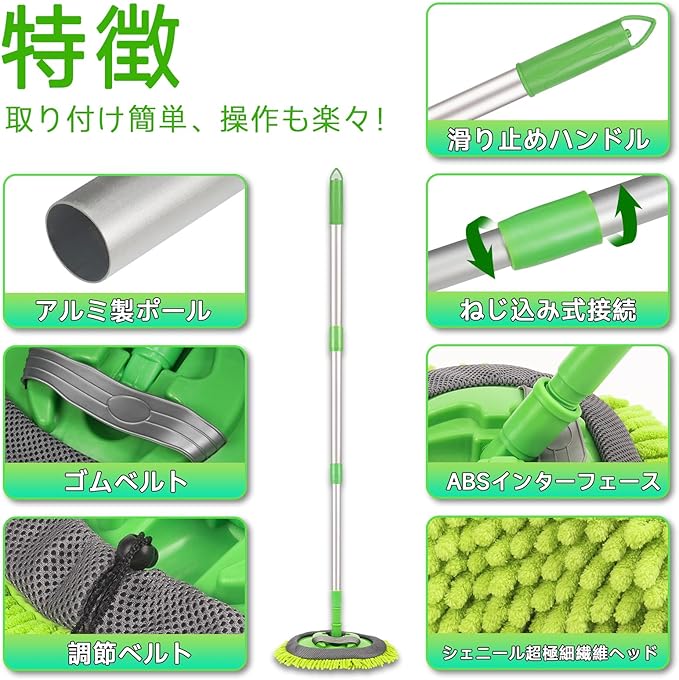 高品質素材:極細繊維のモップヘッドは柔らかく吸水性に優れ、表面を傷つけることがなく毛抜けも発生しません。厚みを増したアルミニウム合金の杆(ハンドル)は軽量で丈夫で、床面や車両表面の清掃に便利です。