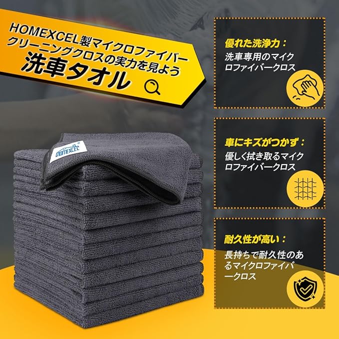 車用マイクロファイバークロス:HOMEXCELマイクロファイバータオルは髪の毛の1/100の細さのマイクロファイバー繊維で作られており、その独特な超極細繊維により、極上の柔らかさ、優れた吸水性、速乾性を実現しています。このため、カー用品としては非常によく使われます。