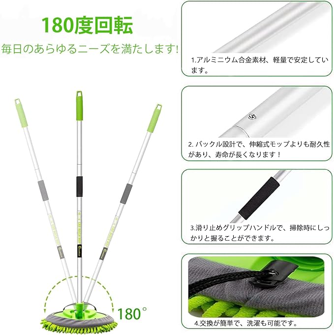 【180度回転して掃除】腰に負担をかけません」これで伸ばす、曲げる、またはねじる必要がなくて、全てのことをできます。このアルミニウム合金製のモップは160cmまで伸びるだけでなく、モップヘッドは180度回転して、掃除することができます。この洗車モップは、RV、車、SUV、またはトラックの上部に簡単に届きます。車のフロントガラス、タイヤと塗装掃除、家庭掃除に最適です。