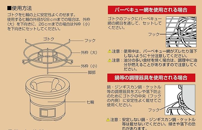 アミや鍋、鉄板、ジンギスカン鍋等が七輪で使用できる! ●フックが付いているので、アミや鉄板がズレにくい ●七輪に直接、鍋等をのせず、ゴトクにのせるから空気がまわり火力が落ちない