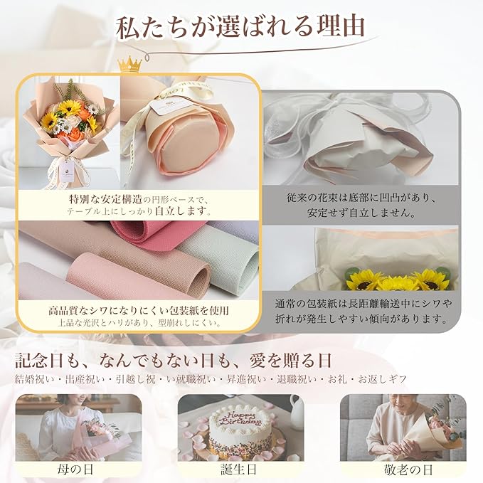⑤ 多様なギフトシーンに対応:誕生日、母の日、敬老の日、結婚祝い、開業祝い、記念日、バレンタインデー、退職祝いなど、あらゆるシーンで活躍するフラワーギフトです。ビジネスギフトやイベント、ホームパーティーにも最適。特別な気持ちを届ける贈り物として幅広くお使いいただけます。