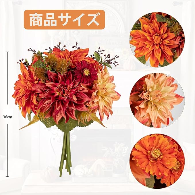 【商品仕様】全長36CMのダリアブーケです。 オレンジ色のダリアは、秋の暖かみや落ち着きのある雰囲気を演出します。紅葉の季節にぴったりで、部屋の中に秋の色合いを取り入れ、心地よい温かさを感じさせます。