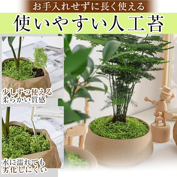 盆栽・鉢植え・庭園・ジオラマ・模型などアイディア次第で様々な用途でお使いいただけます。屋内/屋外問わず設置できる人工苔は、虫が寄ってきたり植物ならではの臭いが無いところもポイントです。