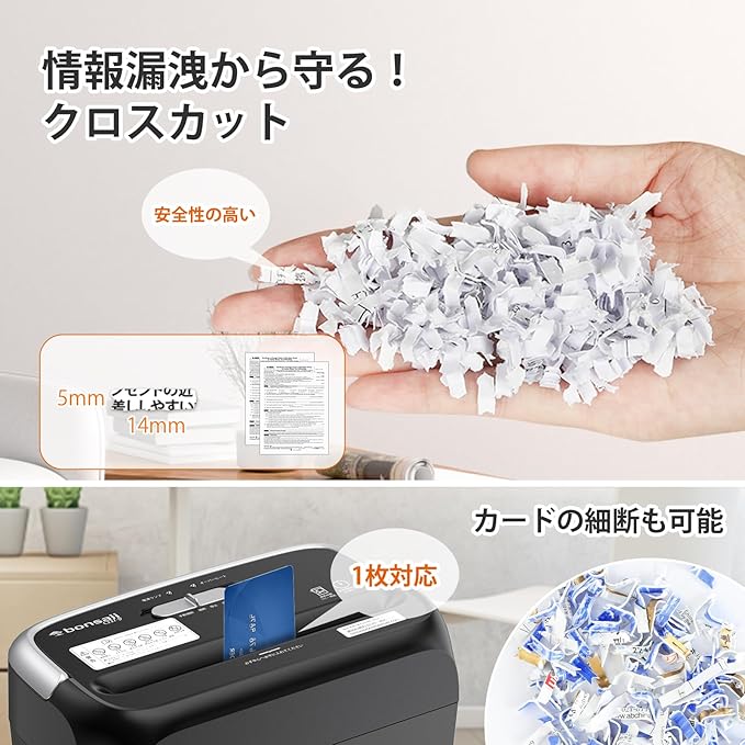bonsaii シュレッダー 5枚同時細断 連続細断4分 5x14mm細密クロスカット カード類対応 電動 家庭用 ハンドルアップ式 13L容量 コンパクト 省エネ 小型シュレッダー ブラック C237-D黒 | etshop