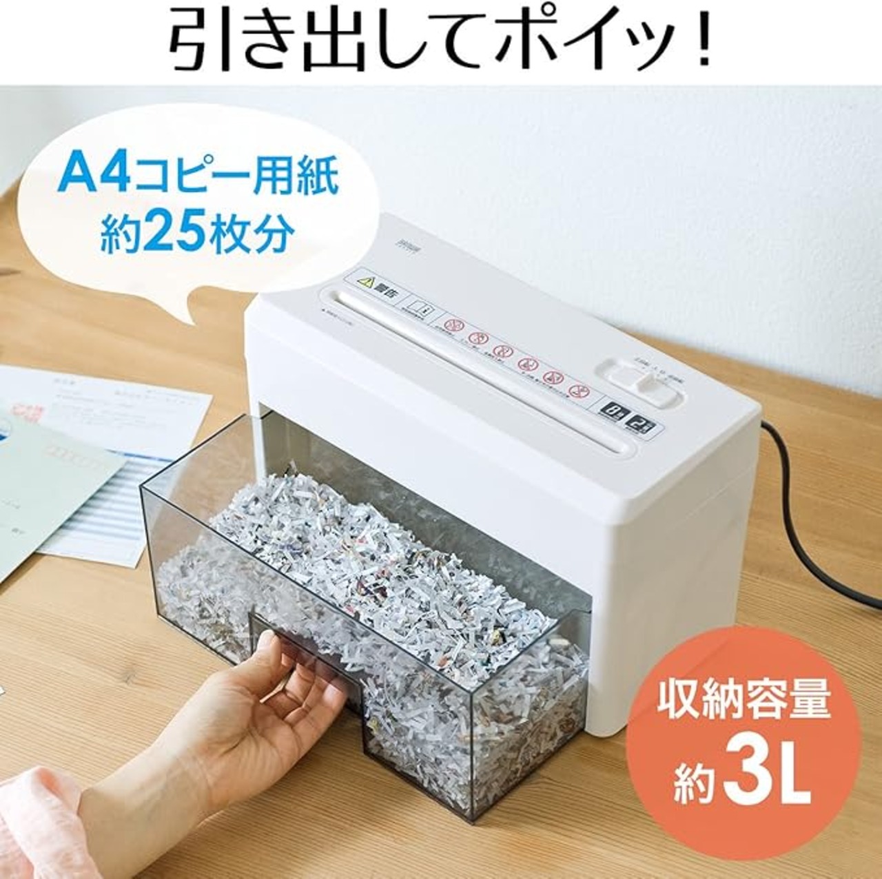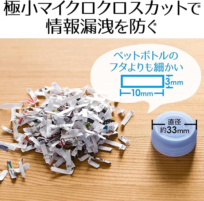 卓上に置けるコンパクトな電動シュレッダーです。置き場所に困らない小型サイズで、机上や棚などに省スペースに収まります。細断形状は3 10mmのマイクロクロスカットで、情報漏えいを防ぎます。