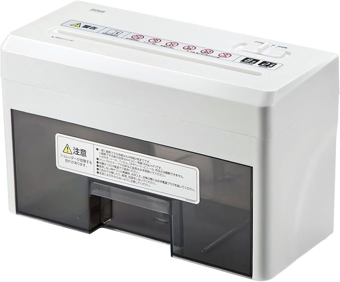 投入口の幅は2mmで、指が入らない安全設計です。ダストボックスが正しい位置にないと動作しない、インターロックスイッチ付です。投入口に紙が投入されると自動的に細断、終了すると自動的に停止する、オートスタートストップ仕様です。