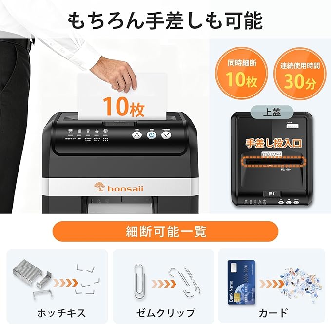 bonsaii オートフィードシュレッダー 300枚自動細断 2x10mm極細マイクロカット 業務用 静音 大容量31L カード/ホチキス対応 節電モード搭載 自動送り機能 ブラック C283-C | etshop