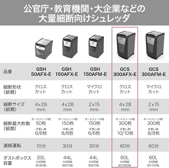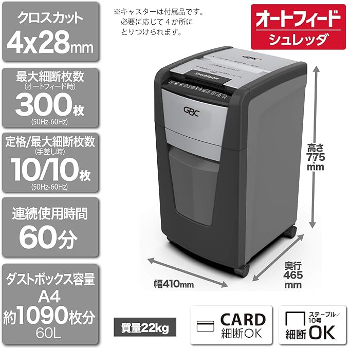 GBC オートフィードシュレッダー 静音 オフィス用 業務用 自動細断A4コピー用紙300枚 連続使用約60分 プラスチックカードも細断可能 ダストボックス容量60L オートフィード時約1090枚収容 クロスカット オートフィードシュレッダ ブラック GCS300AFX-E
