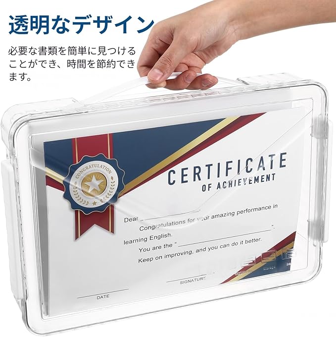 【可視収納機能】透明ファイルボックスは内容物を瞬時に確認できます。書類や証明書を探す時間を削減する透明設計ケースです。