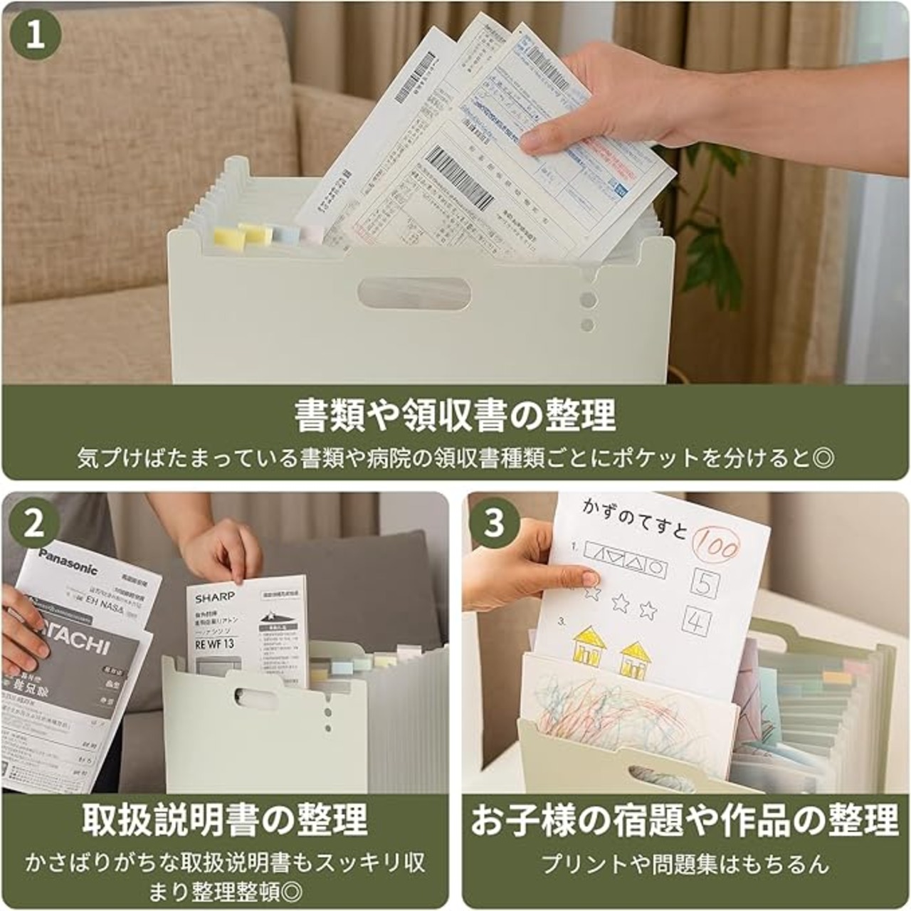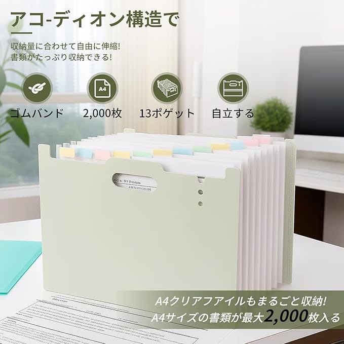 【幅広い用途】13ポケット拡張ファイルフォルダ、A4用紙約1000枚収納できます。資料、カード、通帳、伝票、封筒、領収書、プリント、書類、しおり等の分類整理に便利です。自宅、オフィス、学校、書斎など、さまざまな場所でファイルやメモを保管するのに最適です