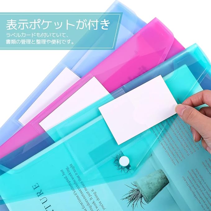 【書類を管理に】:表示ポケットが付いてボタン式クリアファイルです。12枚ラベルカードも付いていて、名前やカテゴリーを書くことができます。書類の管理と整理や便利です。名刺など入れて所有者を表示できて、内容物や書類の分類や探しがよりやすくなり、整理に便利になり、何を収納しているかが一目でわかります。