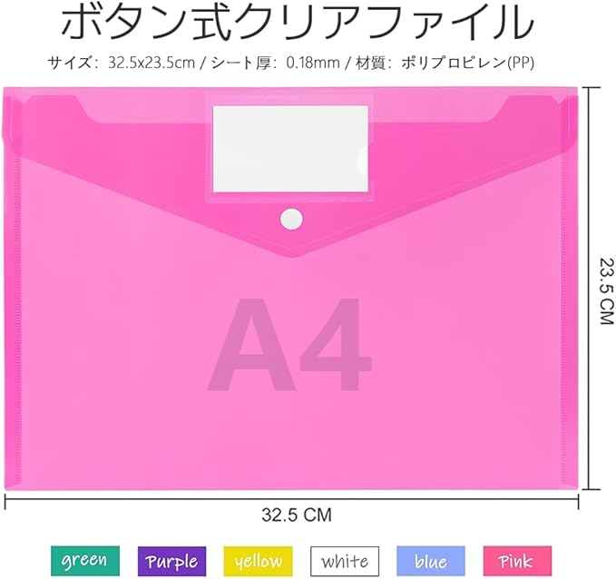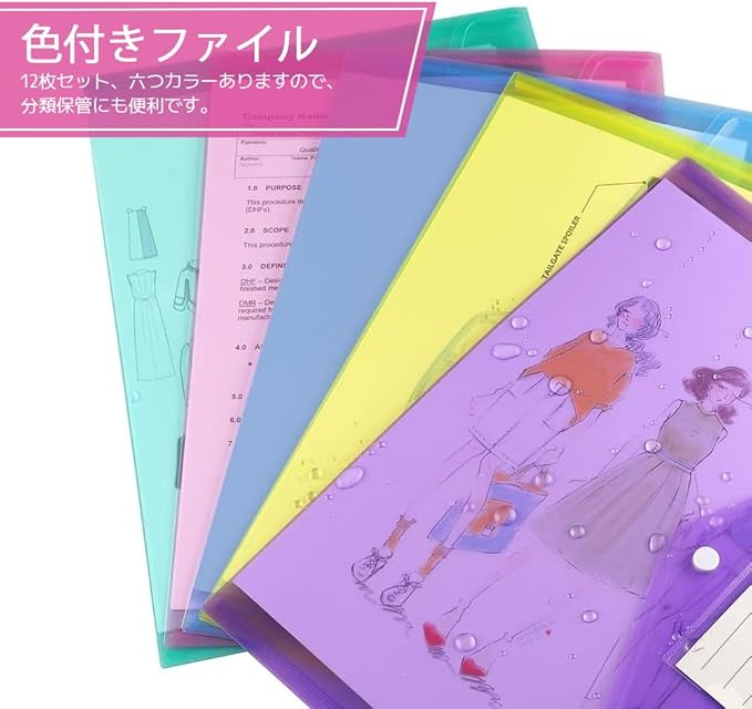 【A4書類を簡単に保管】:規格:A4 /外形寸法:縦325 横235mm。材質:ポリプロピレン(PP)。12枚セット(6色 2枚) おまとめ買い向け12枚パック、お得です。カラー:ホワイト、ピンク、イエロー、ブルー、パープル、グリーン。。六つカラーありますので、分類保管にも便利です。透明なので、中身が見えて書類などの確認が簡単に出来ます。表示ポケット付いて、中身の物の説明や整理にとても便利です。