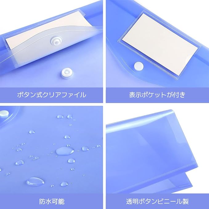 【書類を保護に】:透明ボタンビニール製のクリアファイルです。防水機能がついているため、雨の日でも重用な文書を守れて安心して使えて、0.18mmのしっかりした厚さなので繰り返し使えたり、裂けにくいです。 大量の書類を持ち運ぶのに最適な、スナップ式のクリアホルダーです。中身がバラバラと飛び出すことを防ぐスナップがついておりこれならカバンに入れたままでも書類を挟みこんで保管し、保護の役割を果たします。
