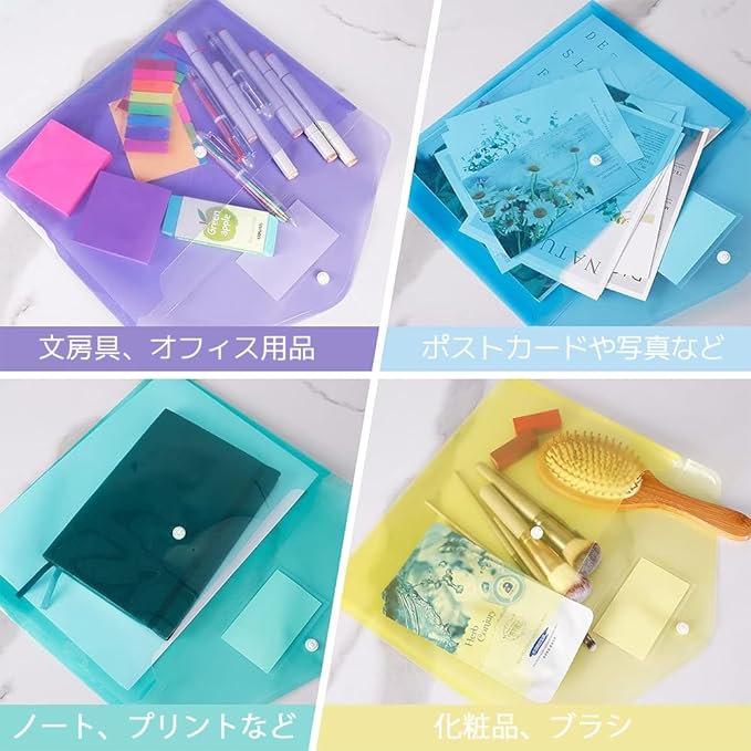【いろいろ用途】:普段使いから提出や郵送時の書類の保護に大活躍。幅広い用途で使えます。会議の配布資料を運んだり、プリントとテキストをまとめて入れるサブバッグ代わりにも使えるなど、ひとつ持っておけば使える局面は多いはずです。 ファイルや書類、論文、雑誌、化粧品、領収書などの小物の保管に使用できますし、日常用品の収納や文房具、オフィス用品の収納にも対応できます。