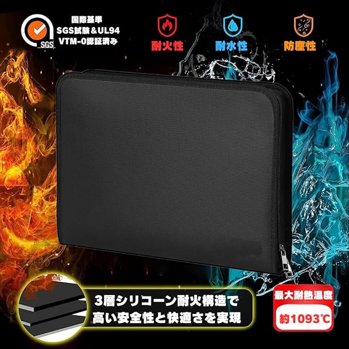 【高耐火・耐水素材で安心保管】 シリコンコーティングのグラスファイバーを二重構造にした安心設計。最大1,200℃の耐熱性と高い耐水性を兼ね備え、大切な書類を火災や水濡れからしっかり守ります。