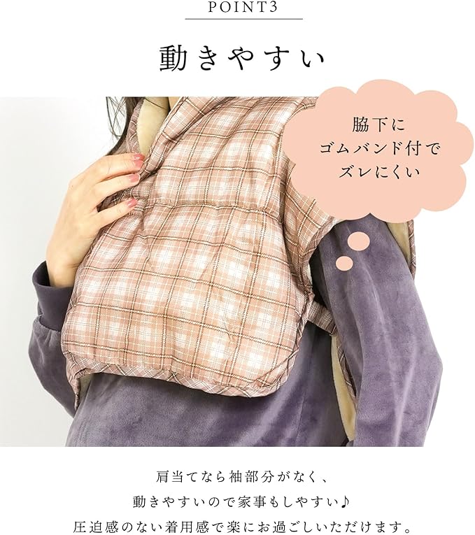 【動きやすい】肩当てなら袖部分がなく、動きやすいので家事もしやすい♪圧迫感のない着用感で楽にお過ごしいただけます。脇下にゴムバンド付でズレにくい◎