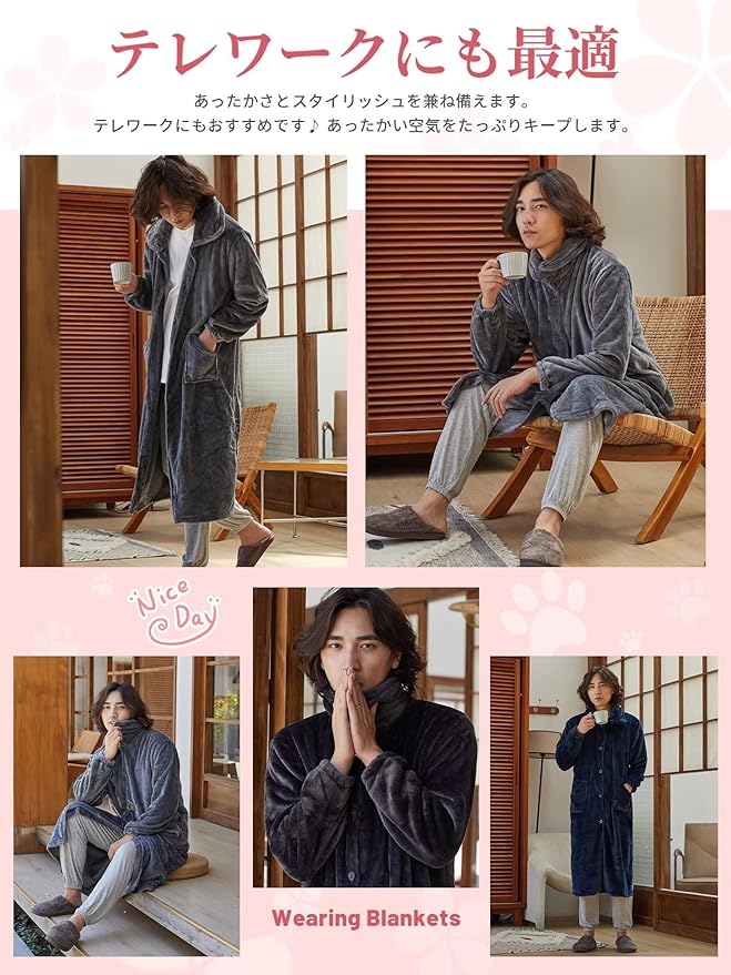 【外出着可能 テレワークにも最適】寒くて布団から出たくない朝も、着る毛布はあなたの心強い味方に。冷え込んだ日にも、さっと羽織ればもうぽっかぽか。テレワークにも最適!あったかさとスタイリッシュを兼ね備えます。家事の時も、食事の時も、薄手で軽いルームウェアタイプの着る毛布だから動きやすい。床のほこりが付かない着丈です。