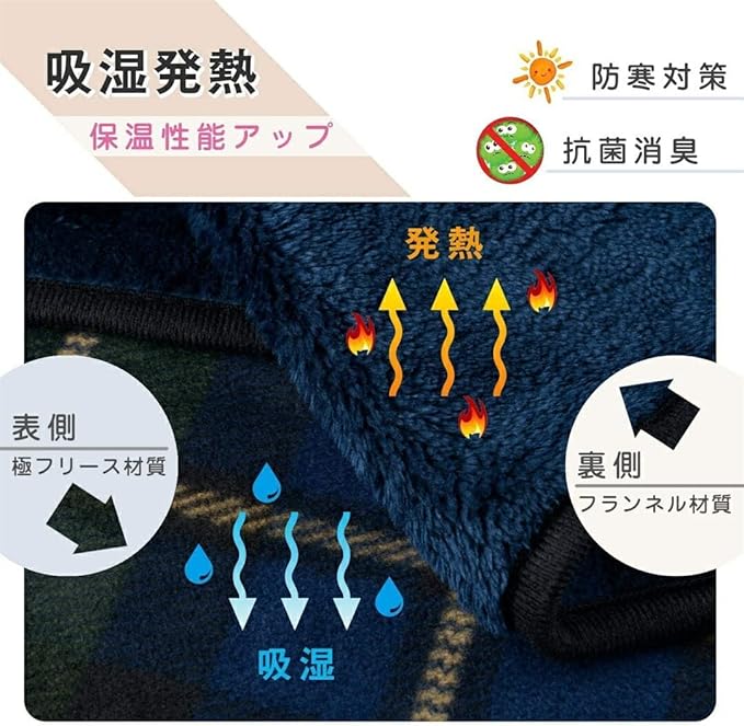 【柔らかくて ふわふわ】裏面は吸湿保温消臭のフランネルを採用、毛玉ができず、肌触りが滑らかで、驚くほどのなめらかさが特徴です。高密度の極細繊維が空気を溜め込むため、ふんわり暖かく包み込まれるような着心地良さです。