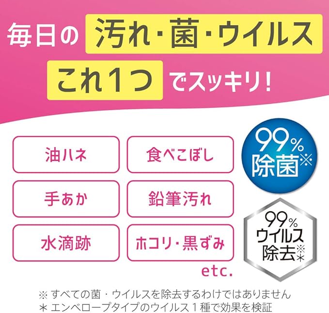 ●テーブルの食べこぼし・洗面台の歯磨き粉・キッチンの油ハネ・冷蔵庫の手あか・ドアノブの菌も、1つで対応