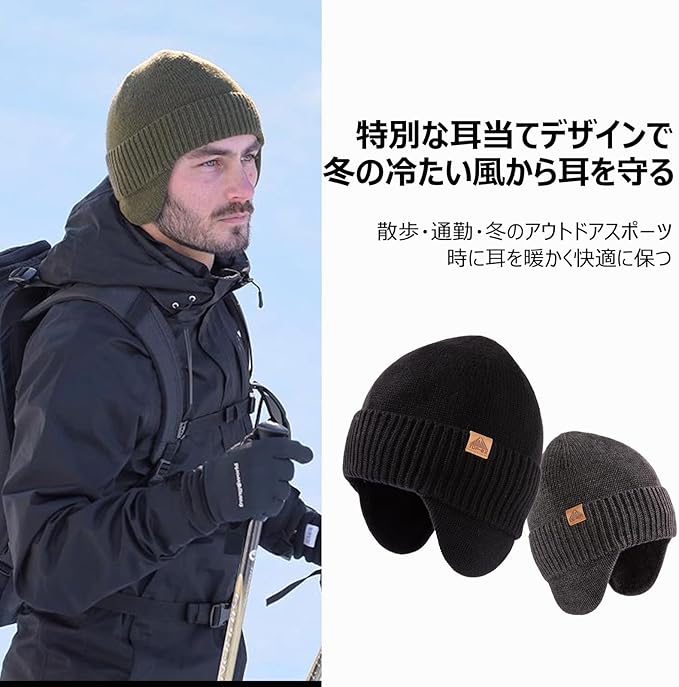 【耳当て付きデザイン】耳当てが一体化したデザインで、耳をしっかりとカバーし、冷たい風から守ります。