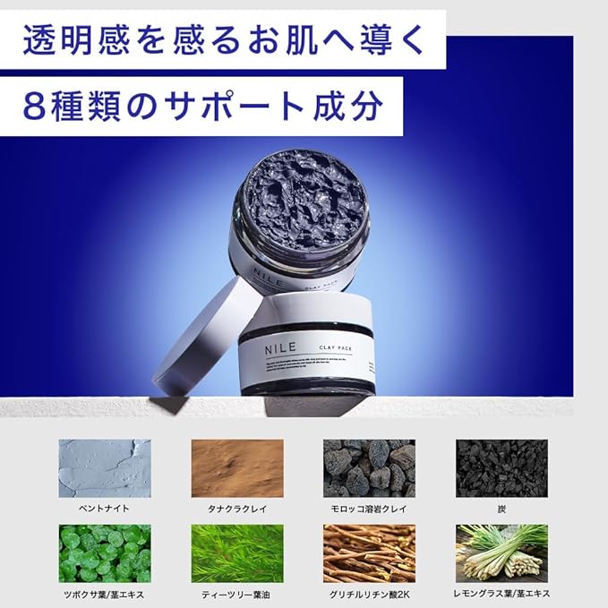 【毛穴のディープな汚れを吸い上げる】蓄積された毛穴汚れ(角栓)を吸引し、曇りのない肌へと仕上げる。4種類の泥で、あらゆる汚れを吸着します。毛穴ケアとしても使用することができるクレイピーリングです。 【イチゴ肌の卒業】粒子サイズの泥が毛穴に潜り込み、汚れをキャッチ。最もデリケートなお顔の肌を清潔かつ、優しく洗浄し、洗い流した後はイチゴのようなポツポツ肌から、もちもちのたまご肌へ生まれ変わります。頑固な鼻頭の汚れもしっかりキャッチ。 【泥の吸着効果と美肌アプローチ】4種類の泥成分はスキンケア用に採取された、ミネラルが多く含まれる泥を使用しています。栄養素の多い泥を使用することで肌を柔らかくし、汚れの落ちやすい肌の下準備をした後に毛穴からゴッソリ汚れを抜き取ります。【クレイ ピーリング】微粒な泥(ベントナイト・海シルト・タナクラクレイ・モロッコ溶岩クレイ)による優しいスクラブで、肌を傷つけないピーリングを行います。自然と化学の融合したクレイピーリングをお試しください。【目に見える泥と炭の吸着力】肌に塗って置いておくだけで、泥に小さなぽつぽつ穴ができ始めます。 これは肌の中に蓄積された汚れが表面上に湧き出てきた証拠です。約10分程で泥が乾燥します。乾燥後はぬるま湯(約36〜40度)で優しく洗い流してください。すると見違えるもちもち肌が泥の下から現れます。 【部分パックとしても利用可能】 気になる部分を集中ケアしたり、不調な部分だけをケアすることで、部分パックとしても利用可能です。塗るクレイパックだからこそ、ケアしたい部分だけをパックしてケアすることができます。