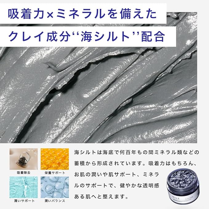 【泥の吸着効果と美肌アプローチ】4種類の泥成分はスキンケア用に採取された、ミネラルが多く含まれる泥を使用しています。栄養素の多い泥を使用することで肌を柔らかくし、汚れの落ちやすい肌の下準備をした後に毛穴からゴッソリ汚れを抜き取ります。