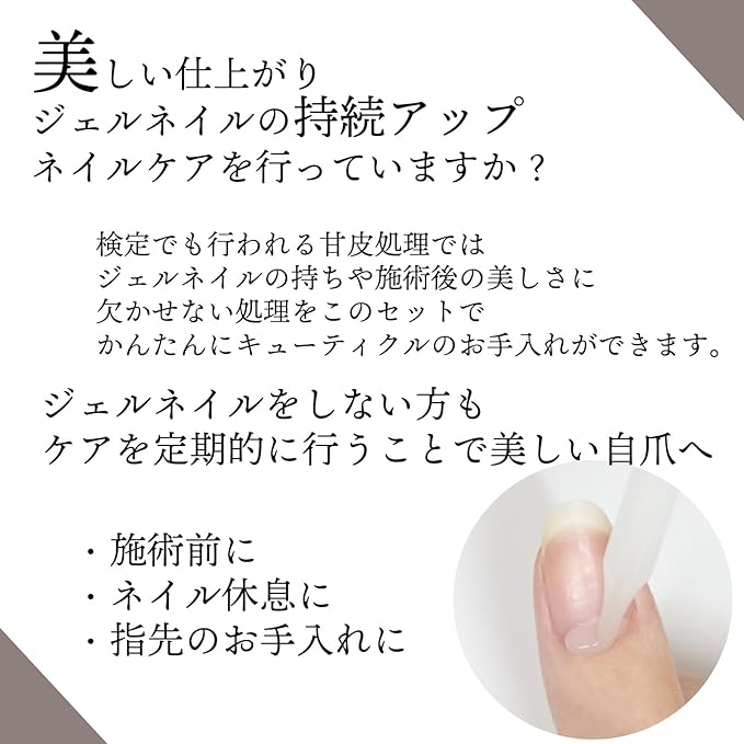 【業務用卸10年以上の実績】LULUGEL甘皮処理セットは、初心者にも簡単に甘皮処理に挑戦できるネイルケアセットです。キューティクルリムーバーは素早く甘皮をふやかしその後のケアを容易にします。ニッパー 甘皮は爪切りニッパーとしても威力を発揮します。ネイルプッシャーもプロ用の先端がとがっていないカーブ形状となっておりプロ好みの仕上がりが実現できるキューティクルプッシャーです。ネイル道具、セルフネイルセットの一つとして加えて頂けますと幸いです。