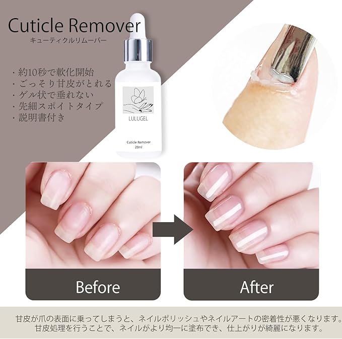 【LULUGEL キューティクルリムーバー】ジェル状で液だれしにくく、速攻タイプなので爪 甘皮処理を効率よく迅速に行えます。ネイル プッシャーがなくても、簡単に甘皮を除去でき、爪ケアの時短に最適です。