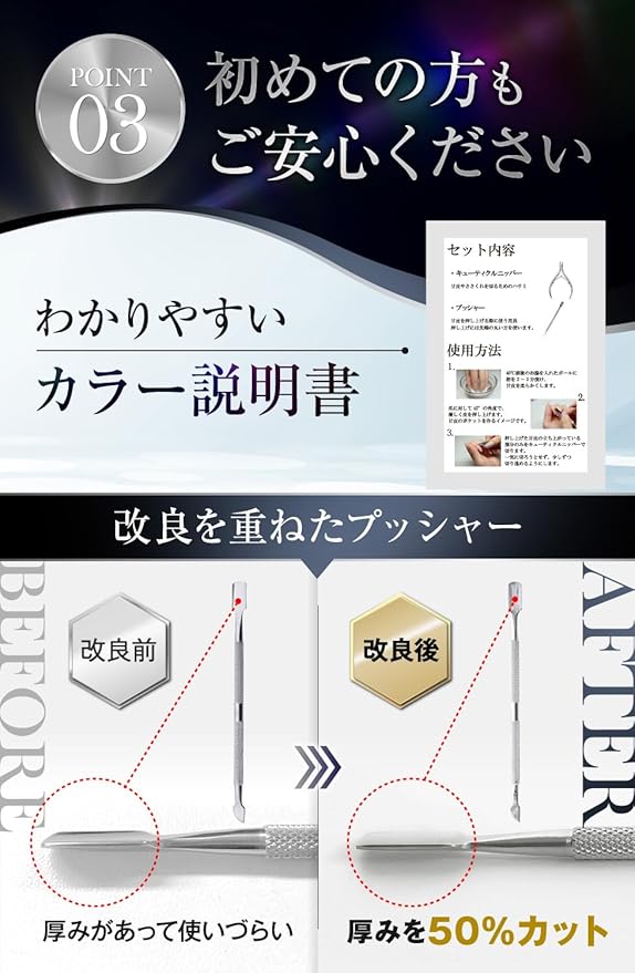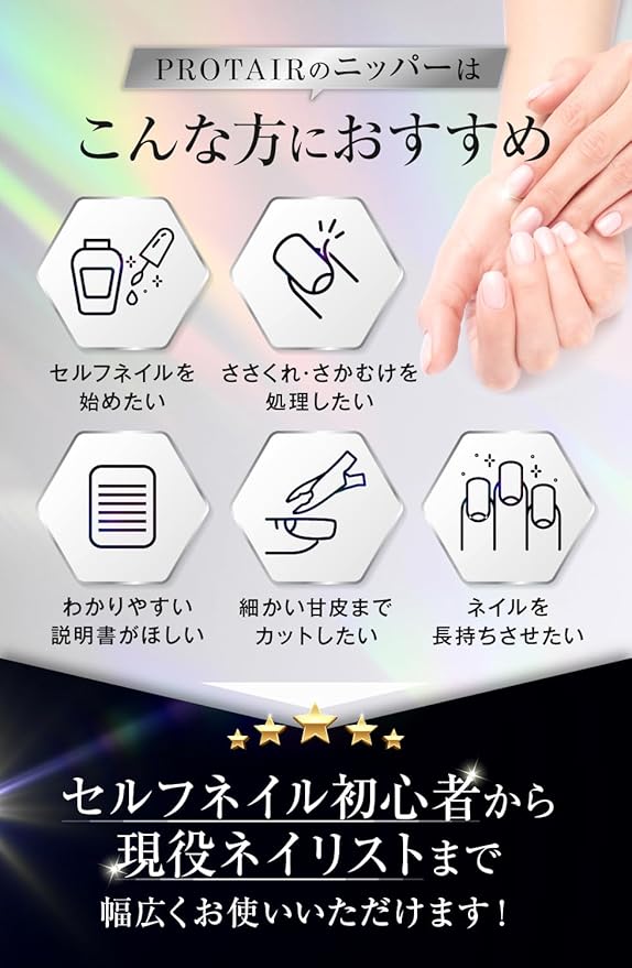 カラー説明書が付いているので、初心者の方でも簡単に使えます。※本製品は甘皮、ささくれ、さかむけをカットするものです。本製品を本使用目的以外の用途に使用しないでください。