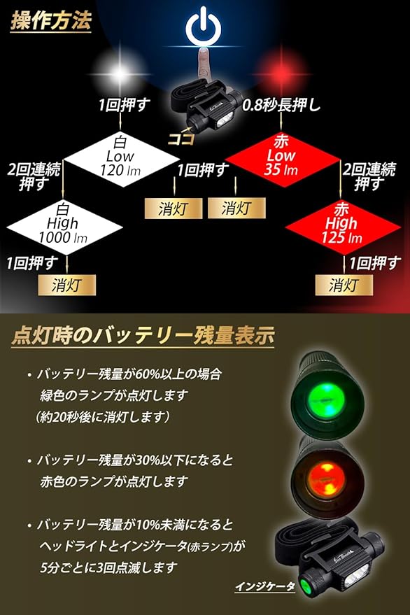 ✅【シンプルで使いやすいデザイン】コードレスで、シンプルな機能とデザインが使いやすさを追求したヘッドライトです。どんなスタイルにも合わせやすく、使い勝手が良いです。