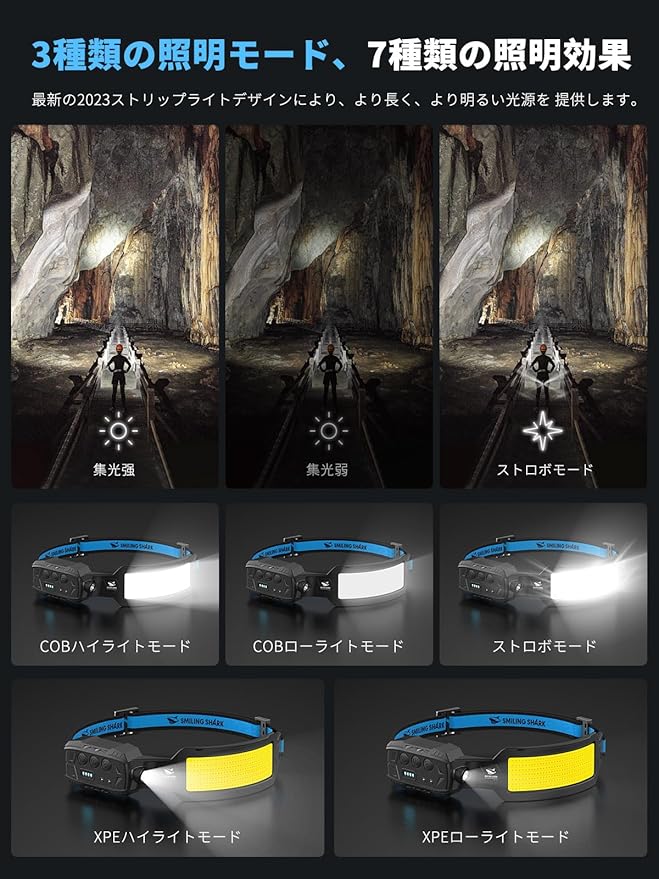 Smiling Shark ヘッドライト, 【LED白&赤ヘッドライト 1個入り】USB充電式 7倍高輝度照明 5000 mAh 長時間使用 人感センサー付き IPX4防水 防塵 釣り 登山 散歩 懐中電灯 キャンプ 作業 災害 停電 最適 | etshop