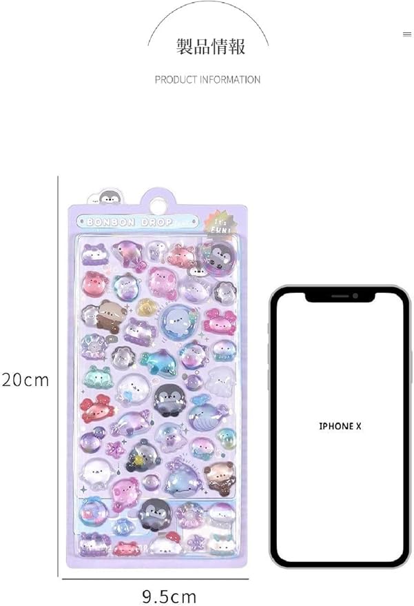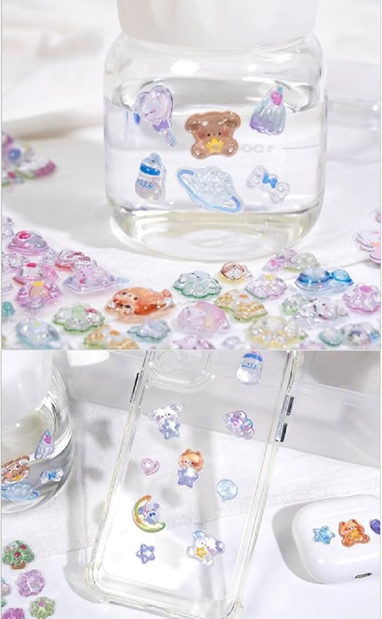 豊富なデザイン: 可愛い動物やスイーツをモチーフにした立体シールが。淡いパステルカラーとキラキラ光るエポキシ樹脂が女の子に大人気。