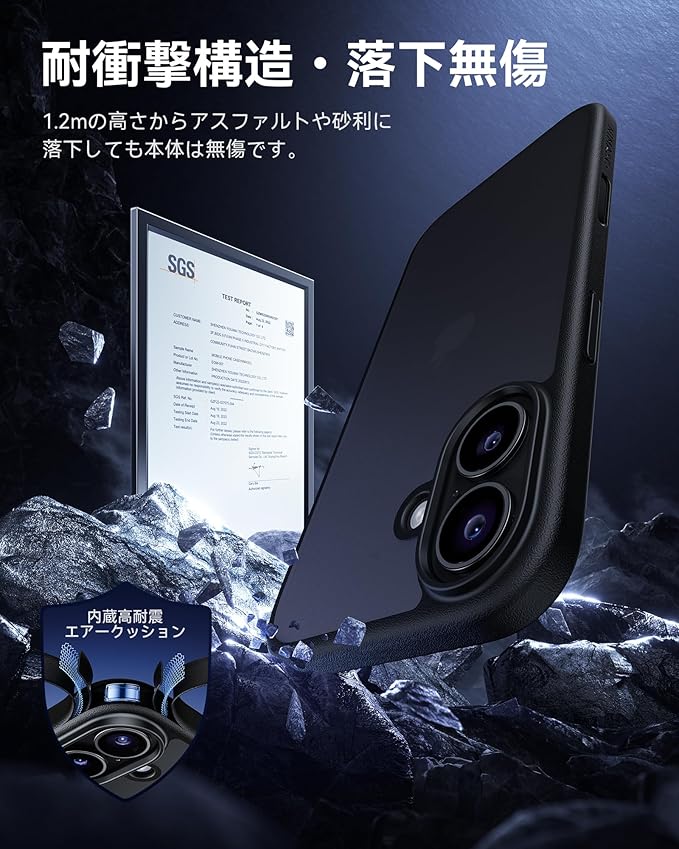 【米軍規格SGS認証・超強耐衝撃性】世界で有名な米国防総省が規定する米軍採用品規格「MIL-STD-810H」認証を取得済み。(認証番号:GZMR220802602301)ケースの縁はいPhone17の液晶画面より1mm、カメラレンズより1.2mm高い。併用の保護ガラスフィルムで平置きしても画面は接触せず、細部まで保護をします。コンクリートの地面に厚さ5mmの合板を敷き、高さ1.2mから合計26回、違う角度から落下させる実験をしたところ、本体に傷はつきませんでした。高い耐衝撃性を誇り、本体を全方位からしっかりと守ります。