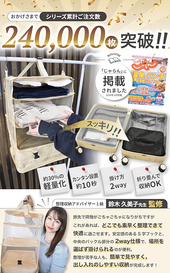 LIXIAから吊り下げ型トラベルポーチが新発売 掛け方2通り、圧縮方法も2通り! お好みに合わせて様々なカスタマイズが可能な持ち運び式衣類収納バッグです。