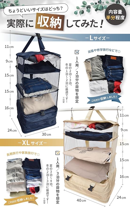 ✅【大容量&取り出しやすい設計】 3つのオープン収納と1つのファスナー収納を備えたLIXIAトラベルポーチは、Lサイズで1〜2泊分、XLサイズで2~3泊分の衣類をきれいに収容可能です。特に1段目には小物用のメッシュポケットがあり、洗面所のポールやホテルの収納スペースに設置しておけば、毎日のコーディネートが簡単に行えます。出発前の朝も、すぐに必要な服を取り出せるため、手間を減らして快適な旅行をサポートします。