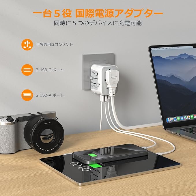 【1台5役 海外変換プラグ】2つのUSB-Cポートと2つのUSB-Aポート及び1つのマルチタイプコンセントを搭載し、5台のデバイスを同時に充電できる変換プラグです。海外ホテルで宿泊する際にコンセントが足りなくても困らない。余裕の部分も家族や友人と共有することができます。