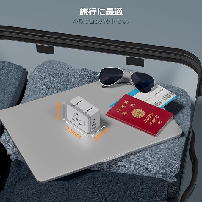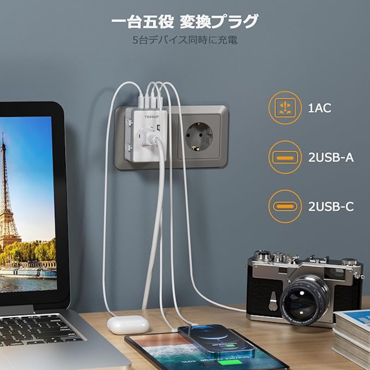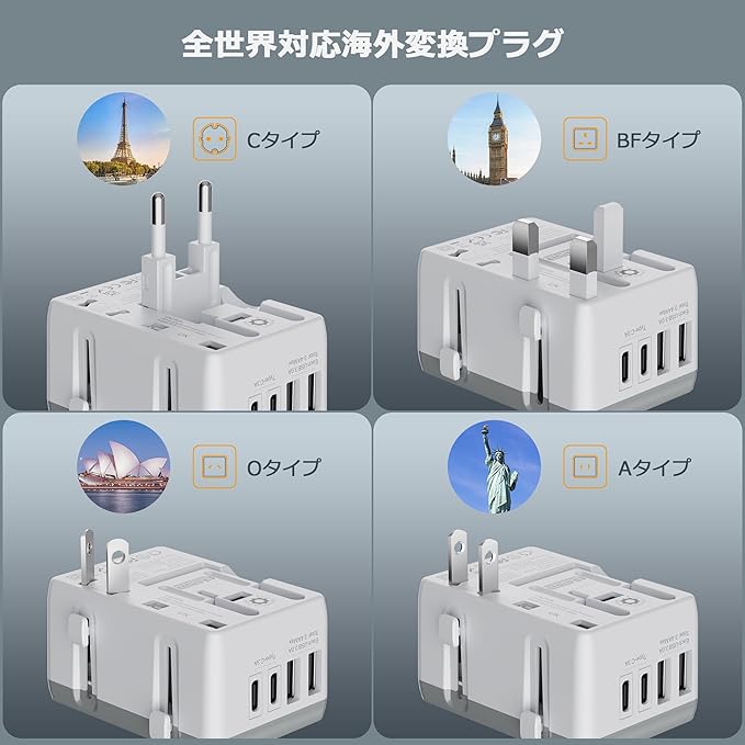 【USB-Cポート付き 旅行充電器】2つUSB-Aポートと2つUSB-Cポートが付いてます。単一USB-Aポートの最大出力は5V 3A、USB-Cポートの最大出力は5V 3Aので、4個USBポートは合計5V 3.4Aになります。このマルチ変換プラグはスマホ、ラップトップ、タブレットやデジタルカメラなど、旅行中のほとんどの電子製品と互換性があります。