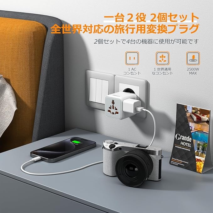 【海外 変換プラグ 2個セット】海外旅行や出張に便利なコンセント変換プラグが2個入り。2個合わせて4台の機器に同時対応できるので、スマホやタブレットなど複数デバイスの充電もスムーズ。荷物が多いシーンでも、これひとつで充電の手間を軽減し、旅先でも快適に使えます。
