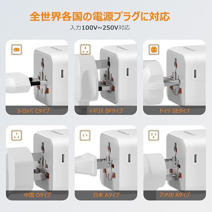 【全世界対応変換プラグ】C・BF・O・Aの4タイプのプラグを搭載し、フランス、ドイツ、韓国、イギリス、香港、アイルランド、中国、アメリカ、オーストラリア、ニュージーランドなど、200以上の国と地域に対応。これひとつで、さまざまな渡航先でもスムーズに使えて、海外旅行や出張の強い味方になります。
