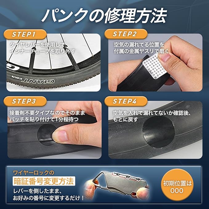 ✅【その他のこだわり】パッチは接着剤不要のタイプでヤスリも付いていて、自転車やロードバイクの応急処置としては簡単で確実なので便利です。 ワイヤーロックは軽さ重視の簡易的なものですが長さもそれなりにあり、ちょっとコンビニに寄るとかその程度の用途にはピッタリです。