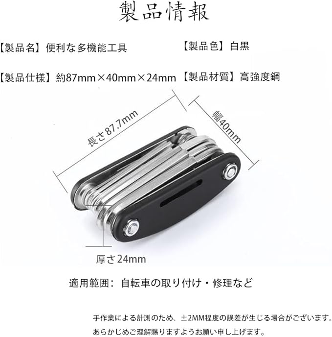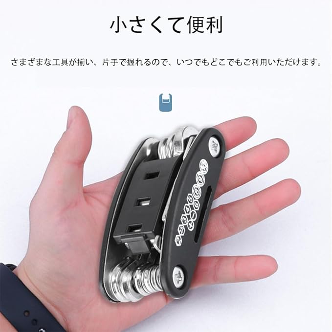 1:【16in1多機能】2/2.5/3/4/5/6mm六角棒レンチ、8/10/15mm六角ボルトレンチ、プラス(+)ドライバー、マイナス(-)ドライバー、ソケット取付バー、8/9/10mmソケットレンチ。自転車の修理、整備、点検、メンテナンスなどのとっさのトラブルに対処できる工具セット。