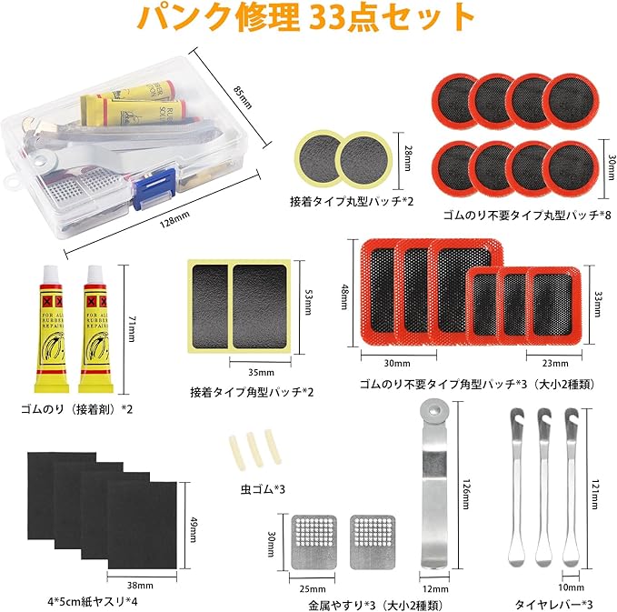 33点パンク修理セット登場:市場およびお客様のニーズに合わせてセット内容を更新し、ゴムのり、紙ヤスリ、さらに多くのパッチを追加します。自転車のパンク修理キットには18枚2種類のパッチ、3つの金属タイヤレバー、2本のゴムのり、3つの金属やすり(大小2種類)、4*5cm紙ヤスリ、3つの虫ゴムが含まれています。通勤、通学のバックに入れておいて自転車に乗ることも心強い!