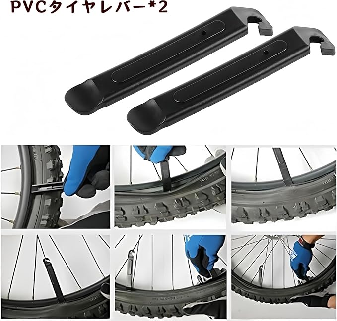 【バイク パンク修理キット内容】16-in-1多機能修理ツール、六角レンチ、PVCタイヤレバー、コンパクトツールバッグ、グルー不要のパンク修理パッチ、やすりが含まれています。