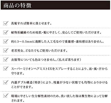 増毛パウダー(植物系抗菌繊維)が静電気で付着して髪を太く見せることにより、自然にボリュームアップしたように見せる商品です。