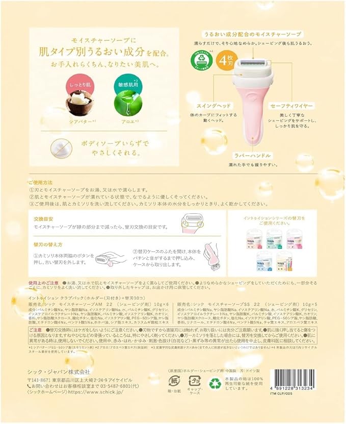 濡らすだけでカミソリの動きをスムーズに。肌にうるおいを与える保湿成分配合ソープとスイングヘッドの4枚刃が、身体の微妙なカーブに合わせて動きます。ソープの減りに合わせて、ヘッドの高さも自動的に調節します。