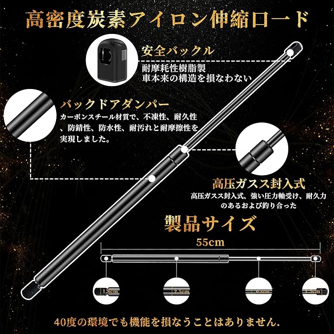 【業界初のロングサイズ55cm以上、ドイツ最新技術を採用】 当社工場ではドイツより最新技術を導入し、専門のドイツ人技術者が開発を担当。製品の硬度と長さについて実車で20,000回以上のテストを実施。全長55cm+で他社製品より5cm長く、90度以上の開閉を実現。補強設計により真の90度開閉が可能で、大型物品の出し入れが容易です(他社製品は不安定)。スイッチ操作力20%低減で女性やお子様にも優しい設計です。